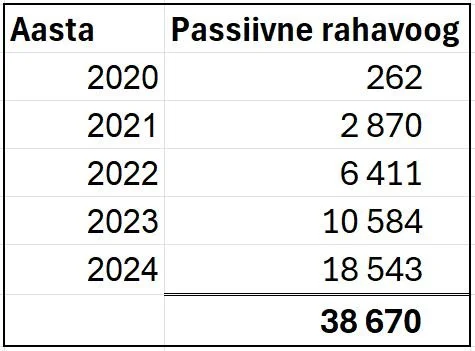 Lisaks vaatasin üle ka portfellist saadud passiivse tulu arengu. Passiivne tulu on siin siis konkreetselt rahavood – dividendid, laenude intressid ja üüritulu; vara väärtuse suurenemine ehk kapitalikasv siin ei kajastu. Passiivne tulu ei ole praegu minu jaoks otseselt oluline, minu eesmärgiks on eelkõige kasvatada portfelli koguväärtust, ja seetõttu on seal päris palju instrumente mis rahavoogu ei tooda (nt indeksfondid, kasvuaktsiad). Seda enam on tore näha, et isegi mitte fookuses olles, rahavoog tasapisi aasta-aastalt kosub. Möödunud aastal teenitud summa eest oma baaskulud kataks juba ära, kuigi elu nautimiseks ja reisimiseks soovitud mahus sellest veel ei jätkuks.